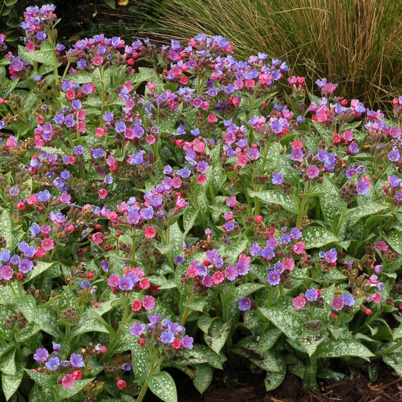 Description: The pink to dark blue flowers cover this plant in spring. Soon afterwards, the silver-spotted leaves take over and remain attractive all summer, giving this plant multi-season interest in a compact plant. In addition, the foliage is mildew resistant and looks right at home with other perennials in shady sites.