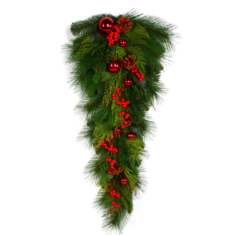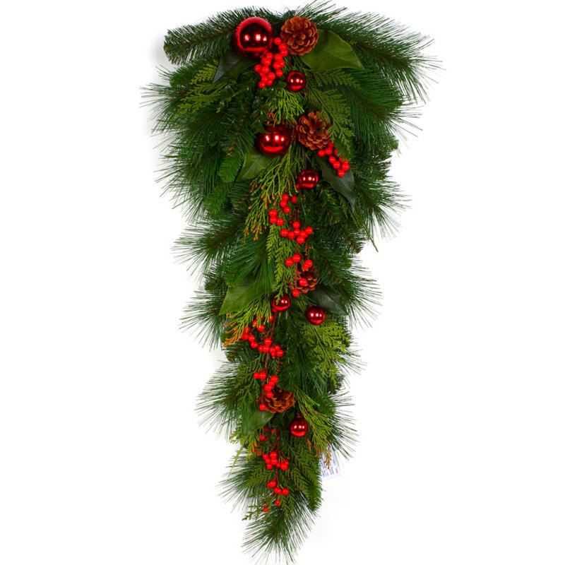 Upscale Hampton teardrop with mixed lifelike greens, pine cones, red berries, and shiny red ornaments. Traditional accent for inside your holiday home. Coordinating wreath, garland, mantel blanket and swag available.