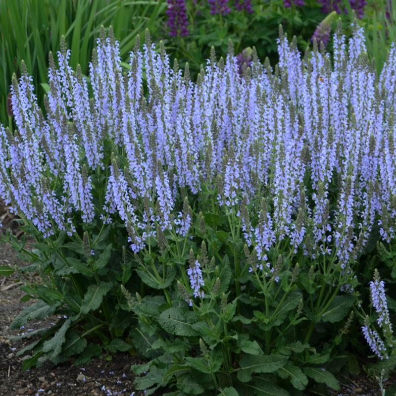| Crystal Blue Salvia is the first of its kind. It is an incredibly unique light sky blue (most perennial Salvias are darker purple), a cool shade perfectly fitting for a perennial that blooms relatively early in the season. Salvia is a staple item for every sunny garden. It asks little more than sunshine and a little drink occasionally in return for producing a bountiful mass of colorful flower spires from late spring into early summer. It forms a dense, rounded clump of aromatic, rugose grey-green foliage that looks nice all season long and is not enjoyed by rabbits or deer. |