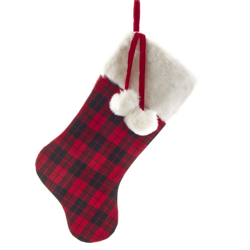 Kurt Adler's red and black plaid stocking is a festive addition to any holiday décor. It features a red and black plaid design with a white plush cuff and pom-poms.