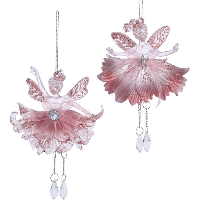 Description: These translucent pink and pewter fairy ornaments from Kurt Adler are a festive addition to any holiday décor or Christmas tree. This assortment features a pink fairy with pewter-glittered accents and finial-shaped drops and a pink fairy with pewter-glittered accents and diamond-shaped drops.