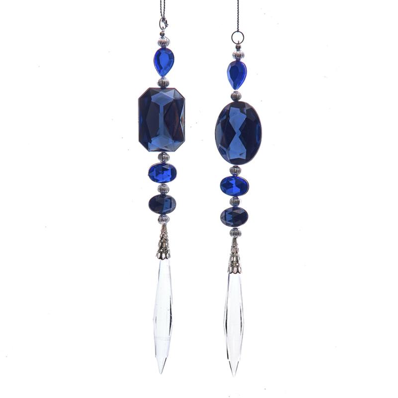 Description: Kurt Adler's blue jewel ornaments are a stunning addition to any holiday décor or Christmas tree. This assortment features a blue square jewel with a clear drop ornament and a blue oval jewel with a clear drop ornament. Silver beads and smaller blue jewels accent each.