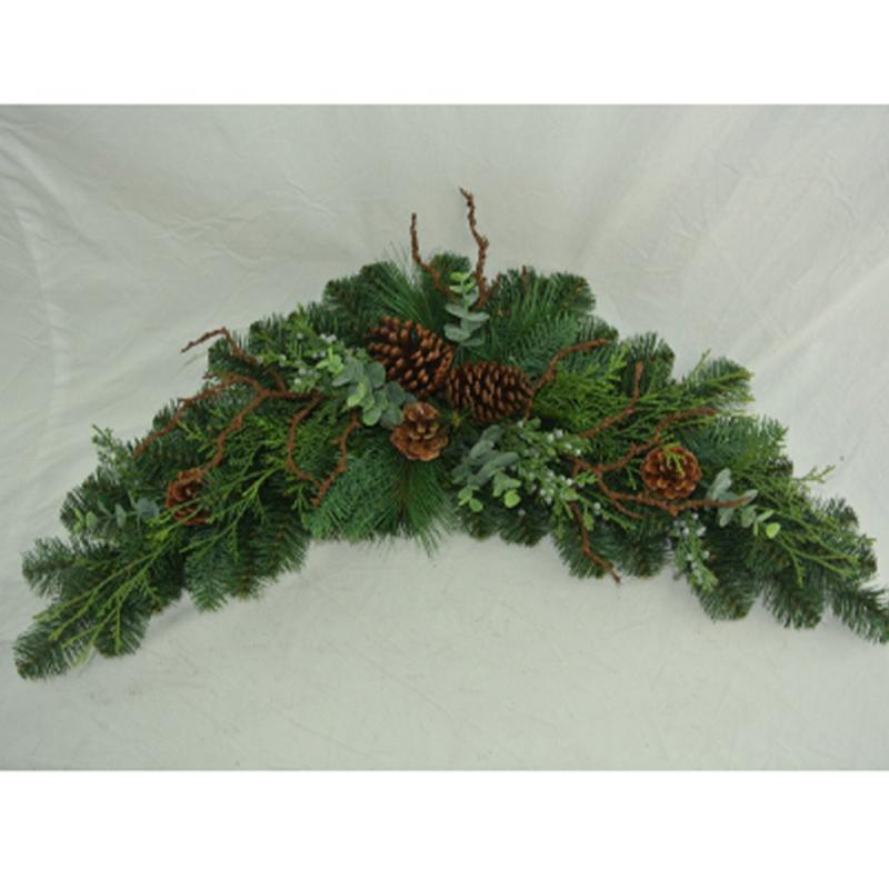 This attractive pine swag with mixed greenery twigs and pine cone accents can be hung over your door or windows during Holiday season
