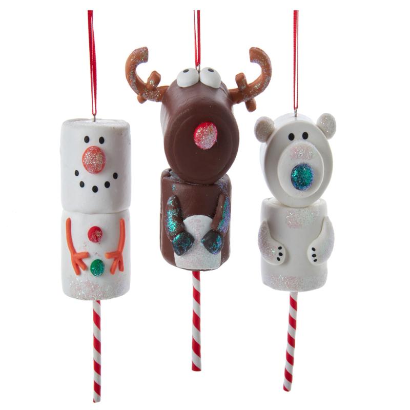 | These marshmallow ornaments from Kurt Adler are a fun and festive addition to any holiday décor or Christmas tree. This assortment includes a snowman marshmallow, a reindeer marshmallow, and a polar bear marshmallow. Each is decorated with glitter for a sugared effect and has red and white popsicle sticks. |