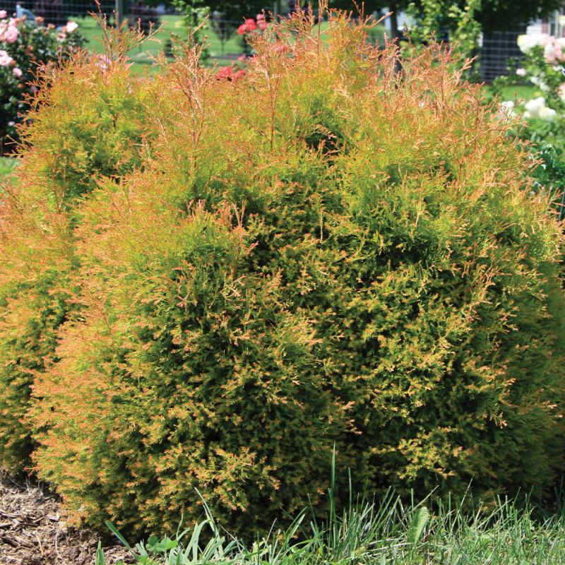 | There are so many uses for this charming dwarf white cedar that a list would delay our precious gardening time! A soft and lacy fine-textured plant, Fire Chief™ forms a perfect round ball. Sage-green foliage is topped with red tips, offering a distinctive look in foundation plantings, low hedges, or borders. And of course, they are splendid elements in containers! Reaching just 3-4' over time, Fire Chief™ requires little to no pruning, making this the perfect, minimal care, landscape plant. |