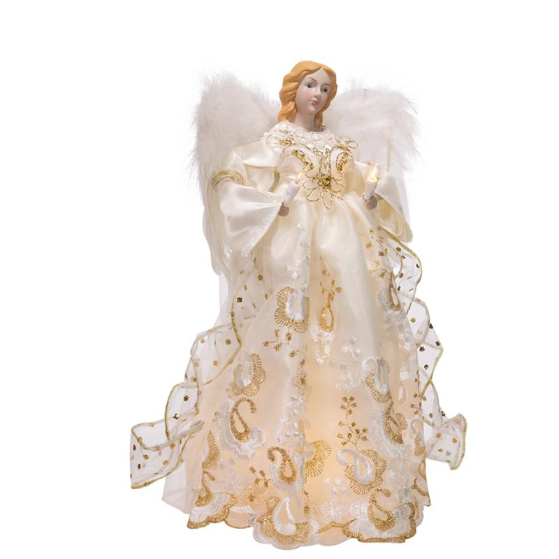 This Angel is pre-lit with 10 UL listed clear incandescent lights. It is made of fabric mache, plastic, and metal. It has a 30" lead wire with plug. It also includes 3 spare bulbs & 1 spare fuse. The Angel attaches to tree by a metal coil base. |