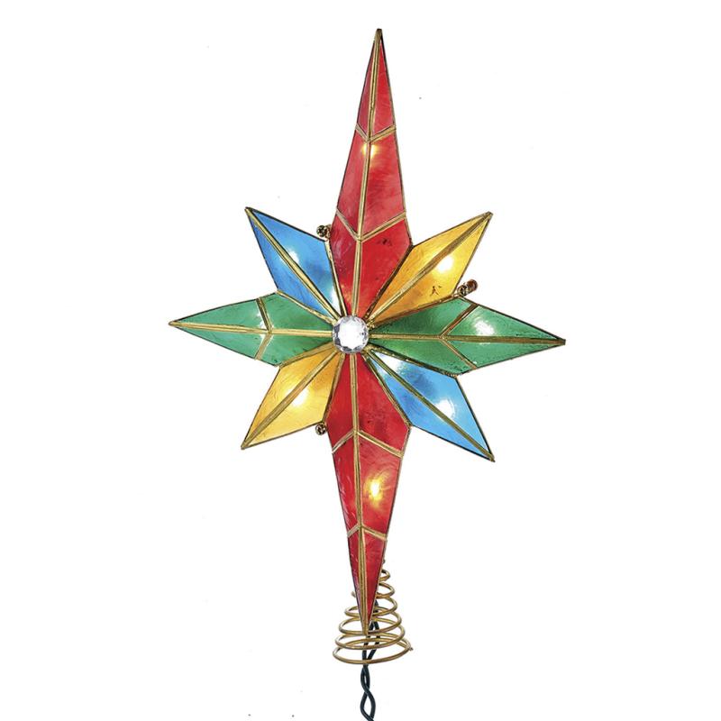 Description: This Kurt Adler multicolored capiz Bethlehem star treetop with gem center is a beautiful, classic way to add to the lighting of your Christmas tree. This 8-pointed star with bright multicolored design is gridded in gold wire and has a shining rhinestone gem at its center.