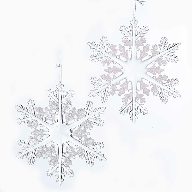 | These Kurt Adler frosted white and clear snowflake ornaments are an elegant addition to any holiday décor or Christmas tree. Each ornament features a crystalline design in acrylic. This assortment features one snowflake with frosty white accents and the other with silvery glitter accents over clear. |