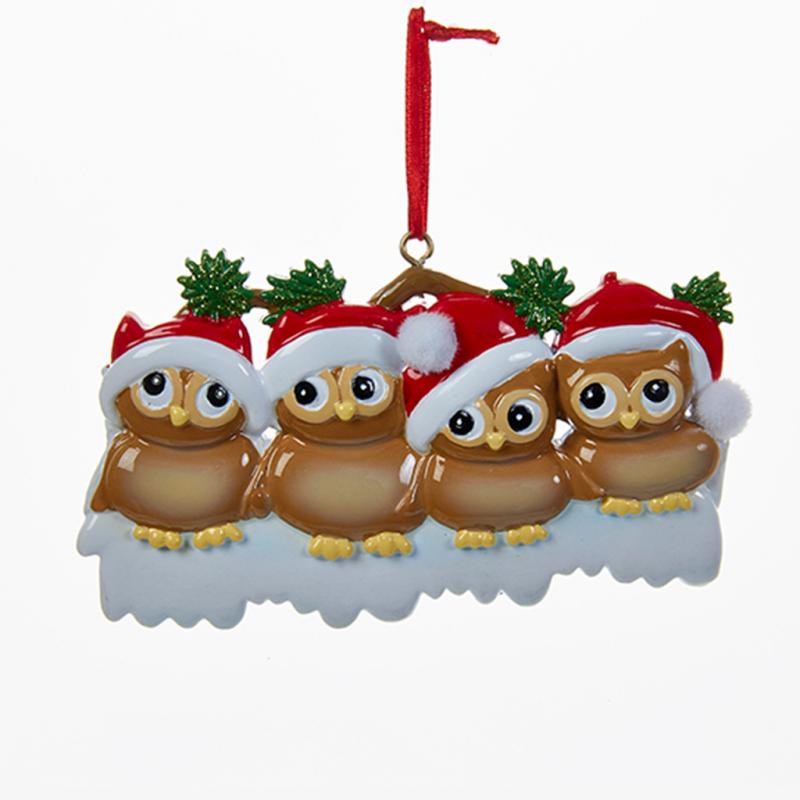 | This resin owl family of four ornament from Kurt Adler is a fun and festive addition to your holiday décor. Perfect for families of four, this ornament features four adorable owls wearing red and white Santa hats and sitting on top of a white snowy base. The cuffs of the hats and the base are blank white, perfect for personalizing with your family members' names at home! | |