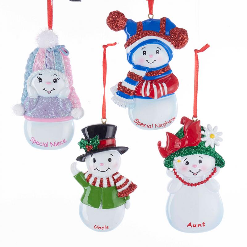 | These Snowfamily "Special Niece, Special Nephew, Uncle, and Anut ornament for personalization from Kurt Adler is a heart-warming addition to your holiday collection. |