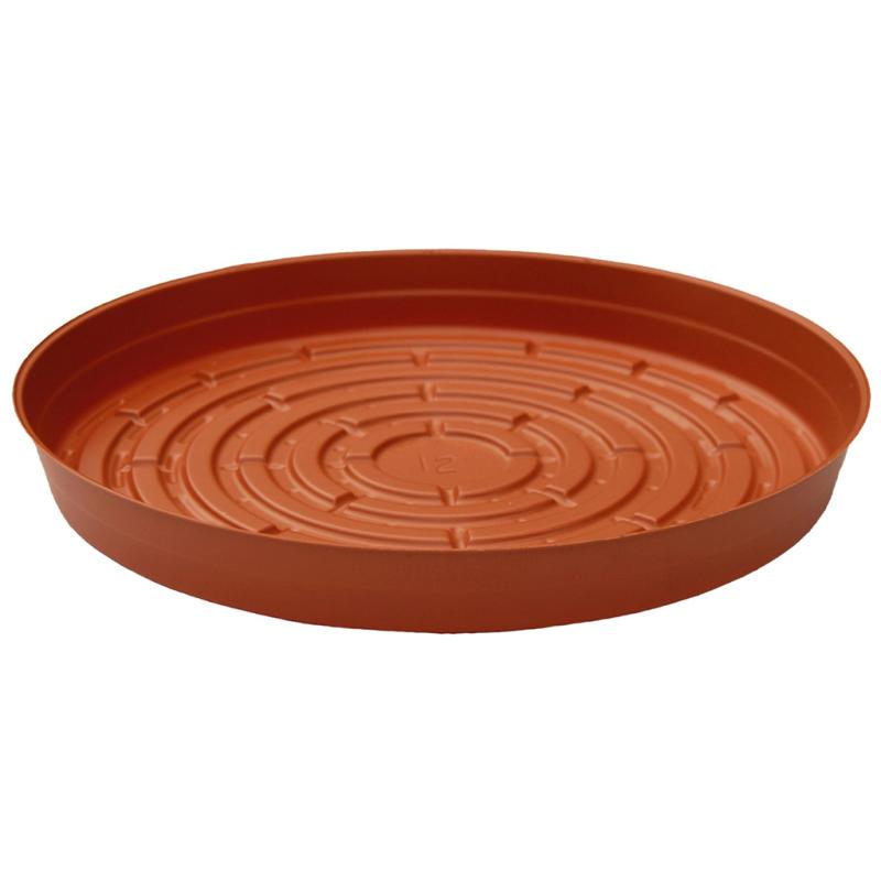 Description: Curtis Wagner Plastics Terracotta Vinyl Plant Saucer. Keep your floors and surfaces spotless with these extra-strong, heavy-gauge, footed vinyl saucers. Designed to protect carpets, hardwood, and tile from excess water and soil, their durable construction ensures long-lasting use while maintaining a clean, terracotta-inspired look that complements any planter.